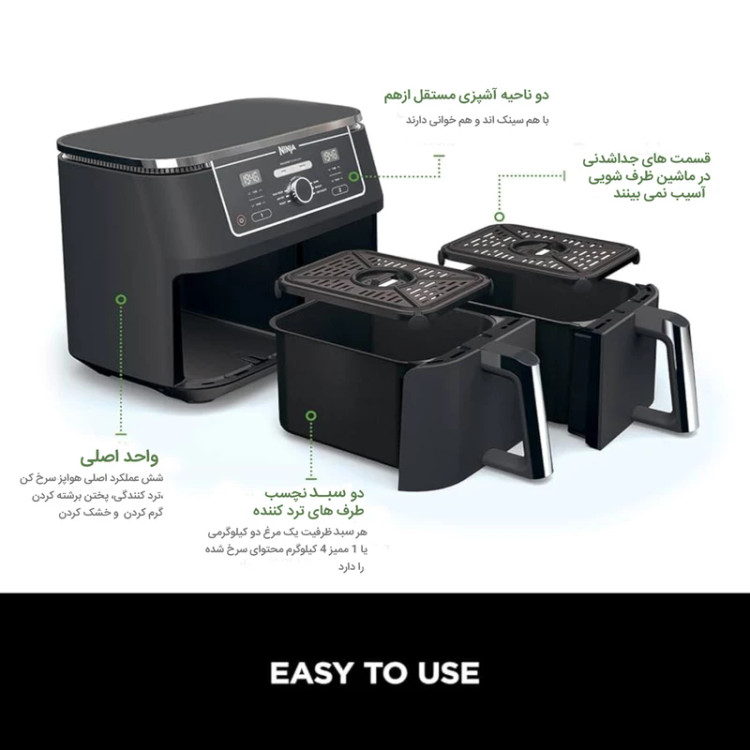قابلیت پخت دو نوع غذای متفاوت در یک زمان، سبد تمام سرامیکی، تکنولوژی Sync، تنظیم دستی دما و زمان