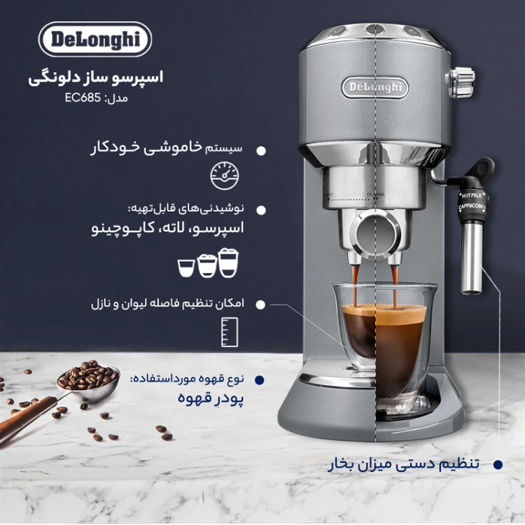 امکانات: تنظیم دستی بخار، قابلیت تهیه اسپرسو تک و دوبل ،کاپوچینو و لاته، تنظیم فاصله لیوان و نازل، سیستم قطع کن خودکار