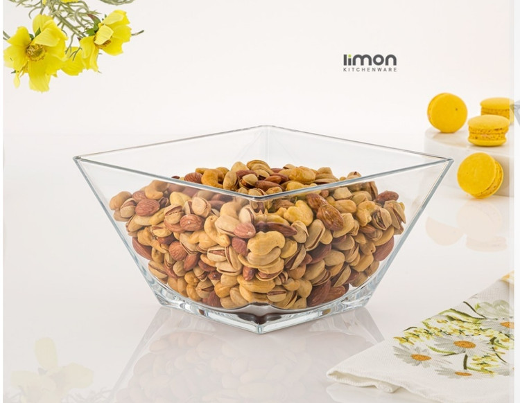 کاسه شیشه ای پذیرایی لیمون جزو یکی از پر مصرف ترین و کارآمد ترین ابزار در انواع مهمانی ها و مناسبت های خاص می باشد که شما می توانید با پر کردن آن با آجیل، انواع میوه های اسلایس شده،، تنقلات و … کاملا میز پذیرایی خود را به یک میز شیک و منظم تبدیل کنید. جنس : شیشه شفاف با کیفیت ابعاد : ارتفاع ۱۱ ، عرض کف : ۱۰ ، عرض دهانه : ۲۰