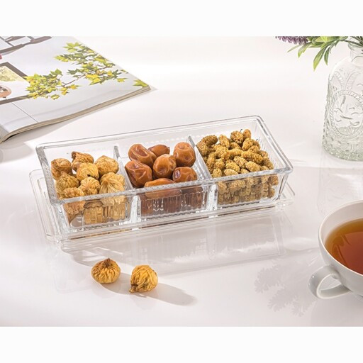 این مدل از ظرف ها دارای سه خانه میباشند که گزینه ی بسیار مناسبی برای استفاده خشکبار و انواع تنقلات میباشد . به دلیل دیواره های جداکننده این ظرف انواع مواد غذایی و خوراکی را جدا میکند . یکی از استفاده های زیبای آن ، به عنئان ظرف ژله میباشد که ژله با طعم و رنگ های مختلف را میتوانید در این ظرف سه خانه درست کنید .